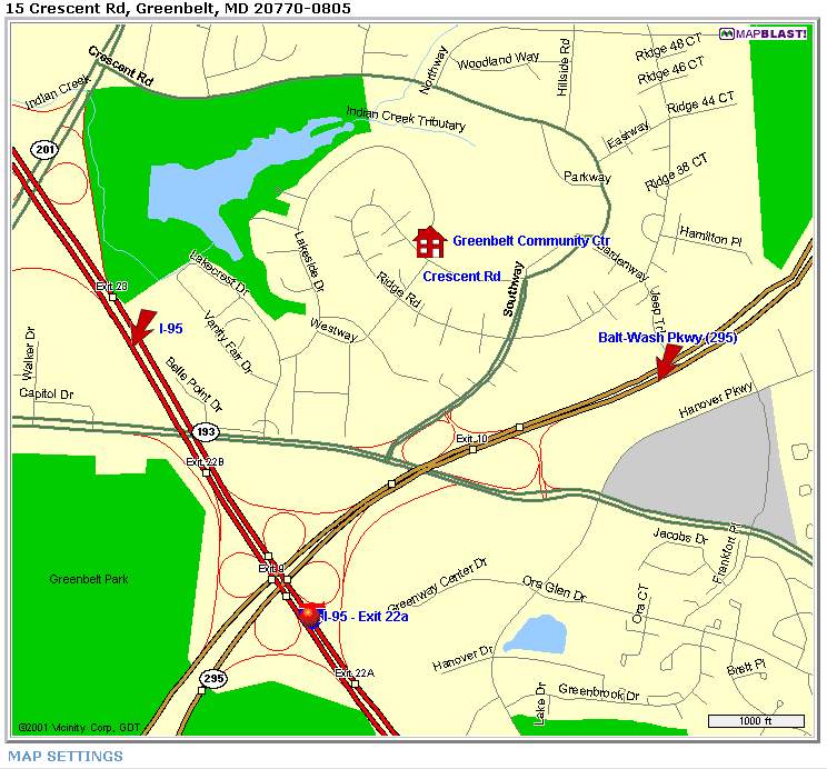 From I-495 eastbound from Silver Spring (this become I-95), take exit 22a (Baltimore-Washington Parkway north / Rt. 295). Go about 1/4 mile, take exit Rt. 193 (Greenbelt Rd. / NASA). Stay in the right lane and at the first traffic light turn right onto Southway. Go through 1 traffic light, then at the second stop sign turn left onto Crescent Rd. At the next stop sign, turn right into parking lot. The door to the Community Center is in the far-right corner of the parking lot.